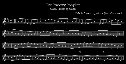 X:1 T:The Prancing Pony Inn T:Caew i Rocheg Gabel M:4/4 L:1/8 C:Yehuda Ronen <r_yehuda@netvision.net.il> R:hornpipe K:D %%MIDI program 41 (Viola) |:BAFE DEFA | dfed BAFA | BAFE DEFA | DEFA dedB | dBAF EFGA | dfed BAFA | BABA FEDE | FBAG FEDA:| |:Bdef gfed | BAFE FBAA | Bdef gfeg | fece dBAB | Befg fede | BAFE FBAA | BAFE DEFA |1DGFA G2FA:|2DGFA GFD2|| |